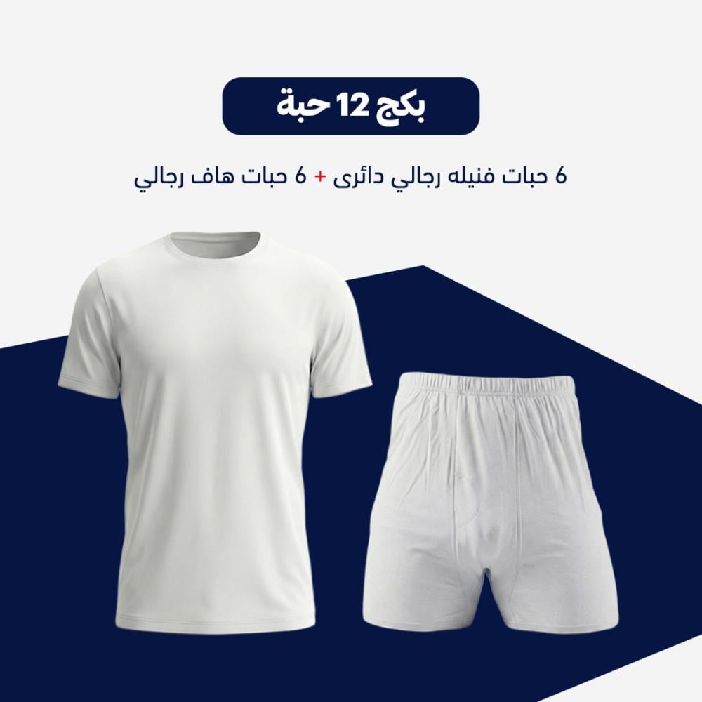 البكج يحتوي على 6 فنيلة رجالي برقبة دائرية و6 فنيلة رجالي هاف، جميعها باللون الأبيض لتناسب الاستخدام اليومي.